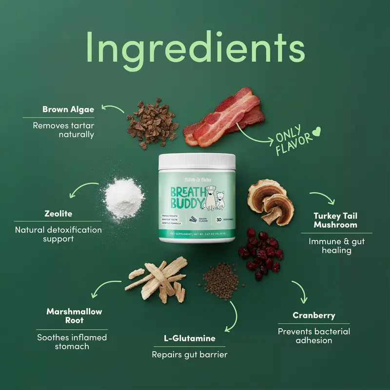 Breath Buddy uses carefully selected ingredients commonly used in pet dental care to support cleaner teeth and fresher breath. We focus on a real, functional formula — not gimmicks.